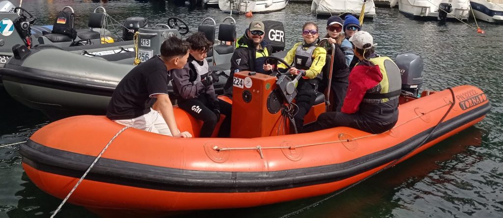 Die fünf Kinder der Opti-Regatta Gruppe haben Starts geübt, Sitzpositionen und Balance im Boot optimiert, sowie Trimm Optimierungen für bessere Höhe ausprobiert und verfeinert. Jeder Tag begann und endete in einer Besprechung zusammen auf dem Motorboot.